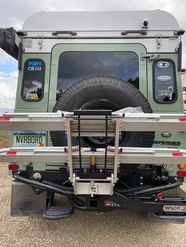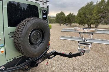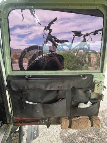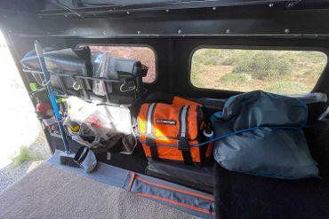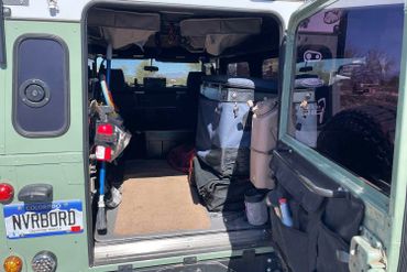It’s well capable of 80 on the highway, tracking straight as an arrow, with heated leather seats and LR a/c. Once you turn off the road, the combination of performance tuned engine components, the adjustable OME suspension with a 3” lift, soft springs and anti-sway bars both front and rear, let you eat up the worst roads and trails with speed in relative comfort. When the going gets rough, it maintains articulation for the slower, technical stuff you might run into trying to camp as far away from civilization as possible. The interior rear is equipped with inward facing seats, a National Luna dual control fridge/freezer curb side, and the extra wheel holder driver rear has been converted to storage for solar panels and other stuff. There is a removable carpet covered "bench" that spans the two benches for your favorite dog(s) so they can have a solid and safe travel experience even when the road gets rough. Soft storage has been added on the rear door and Alucab floor for more overlanding capacity.